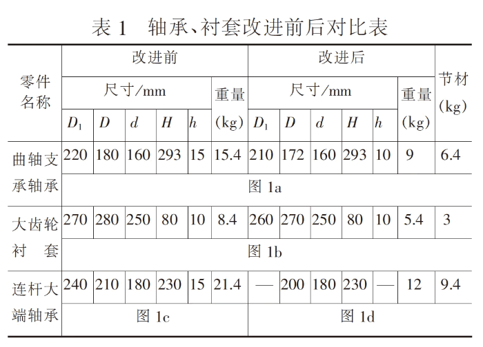由表1可知,方案实施后,曲轴支承轴承(2件/台)可节材12.8kg;大齿轮衬套(2件/台)可节材6kg;连杆大端轴承(1件/台)可节材9.4kg。三者合计则可节材28.2kg/台。以年配套300台压力机,按40元/kg计算,则该项目付诸实施后可降低生产成本33.84万元,经济效益十分明显。